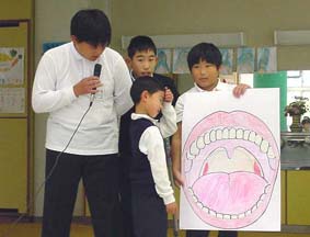 ランチルームで、保健委員会からかぜについてのお知らせをしました。今回は、自分たちで原稿づくりをしました。 かぜのお話のあとは、クイズをだしました。 Q1:かぜをひくと、へんとうせんがはれたりすることがありますが、そのへんとうせんとは、どこでしょうか? 結果は、のどちんこと間違えたり、意外と知らない人が多かったようです。 |