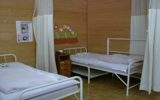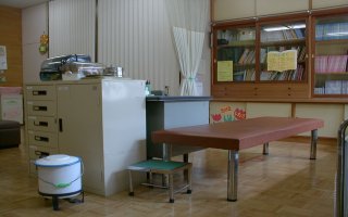 ![]() 休養スペースには、ベットが2つあり、ます。カーテンで仕切ることができます。保健室のベットは魔法にかかったようにぐっすり眠れるようです。時には休養中、BGM(オルゴール音)を流したりします。風邪のはやる時期には2つでは足りなくなることもあり、職員室内の和室に仮の休養スペースを作ります。 |