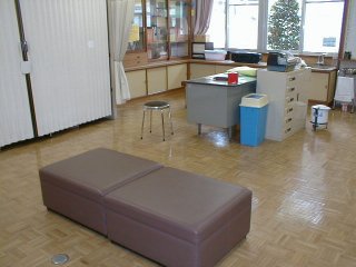 ![]() 保健室は、運動場・中庭に比較的近く、下駄にの隣であるため外科的処置をするにも便利な位置です。 |