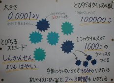 体には、すごい仕組みがあって、かぜウイ ルスに負けないように戦っています 次に、かぜウイルスについて、くわしく言い ます。 ウイルスの大きさは、0.0001mmで、と ても小さくて見えません。 ウイルスの飛び散るスピードは、新幹線よ りも速いです。次に、問題です。小さくて、 スピードの速いかぜウイルスは、クシャンと くしゃみをして、どれくらい遠くまで飛んでい くでしょうか。 |