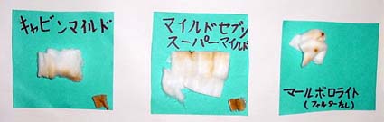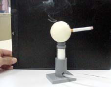 この実験は、たばこ人形にたばこを吸わせて、中に詰めてある綿の汚れ具合を観察し、たばこによる肺汚染を視覚的に知るものです。 |