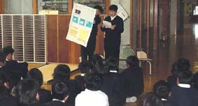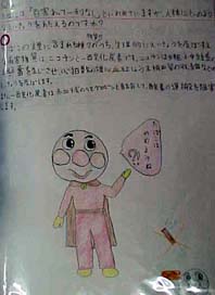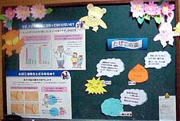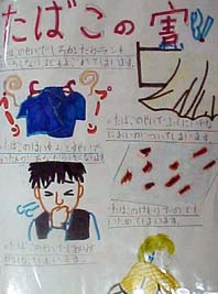 保健委員会で、たばこの害について調べたので、お知らせします。 たばこの煙には、いろいろな有害物質がふくまれていますが、代表的なものはニコチンと一酸化炭素、タールです。 ニコチンは、心臓のはたらきを弱めたり、血液の流れをじゃまして、いろいろな病気をおこします。 一酸化炭素は、血液が酸素を運ぶのをじゃまします。だから、運動能力や頭のはたらきが悪くなります。 ![]() タールは、ネバネバした物質ですが、肺の中をまっ黒にしてがんをつくります。 これは、委員会でした実験の結果です。害の少ないといわれている、マイルドセブンなどのたばこをこの人形にすわせてみましたが、それでもわたがこんなによごれました。わたは、人間でいうと肺にあたります。 ある調査では、中学生や高校生でたばこをすっている人の多くは、最初のすいはじめは、小学校の時だったというデータがあるそうです。しかも、「上級生やとも友だちからさそわれたから」という理由が多いそうです。 みなさんは、そんなとき時にどうしますか?きっぱりとことわる自信がありますか?自分は、どうするか一度、考えてみてください。また、参考になる本などを保健室においていますから、見に来てください。 |
