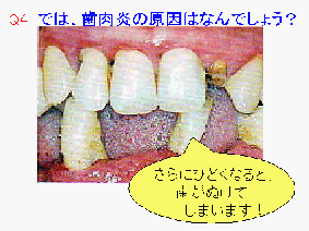 M2:それでは、ここでクイズです。この白くてネバネバしたものは、何だか知っていますか? M1:@たべかす A歯垢 Bおさとう M2:@だと思う人・・・ 正解は、Aの歯垢です。プラークとも言いますね。 司会者:ミュータンス社のみなさん、では、むし歯と歯垢とどういう関係があるのでしょうか?教えてくださいませんか。 M1:はい、わたりました。では、わが社の宣伝部長に説明してもらいましょう。 (宣伝部長の登場) |