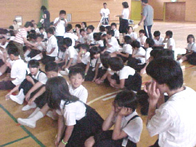 クイズをしながら、むし歯や歯肉炎についての勉強です。舞台上の大きなスクリーンに映しだされたプレゼンテーションは、インパクトがあったようです。